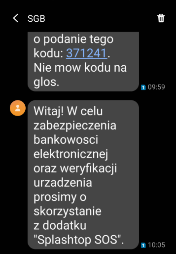 W treści SMS-a informują o rzekomej „podejrzanej aktywności” na koncie i ograniczeniu dostępu ze względów bezpieczeństwa. Następnie proszą o zainstalowanie aplikacji, np. „Splashtop SOS”, aby „zabezpieczyć bankowość”.